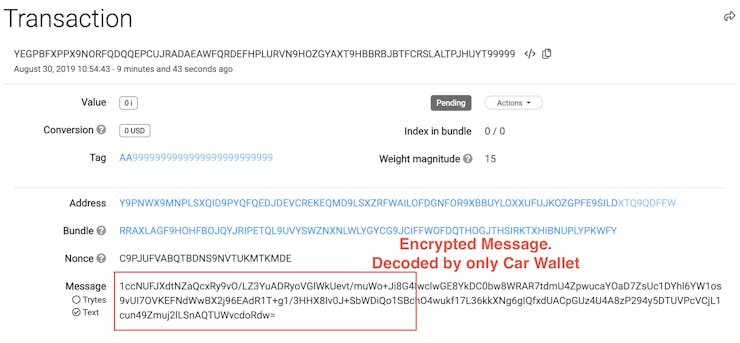 Car device listens for any incoming transaction at the receiving address. Once it receives the transaction, it gets decrypted using the device ID and sends a valued transaction to IOTA tangle for the receiving address of the parking device. At the same time it published a restricted message to MAM for any future audit purpose.