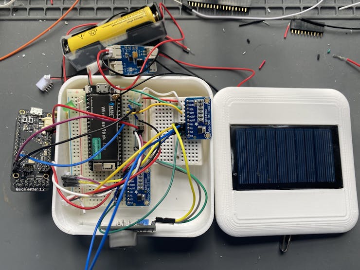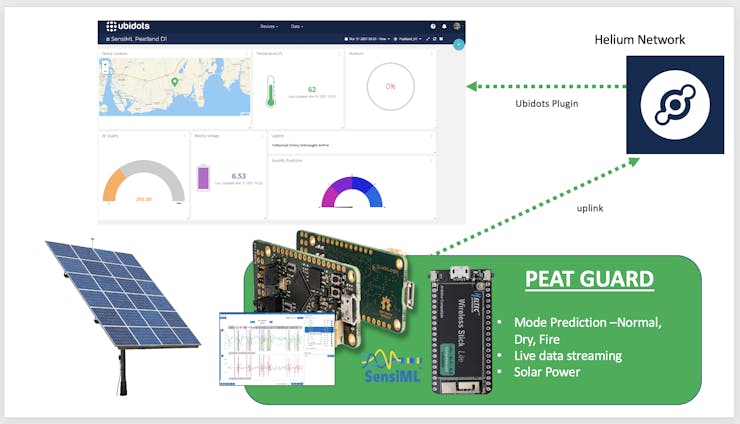 Introducing Peat Guard - A Solar powered device running tinyML model on Quick Feather board equipped with a Soil Moisture Sensor, Analog Temperature sensor and MQ7 CO2 gas sensor. The has a LoRa node - Heltec Wireless Stick Life which sends UPLINK data to Helium, The People Network which feeds data to Ubidots dashboard.